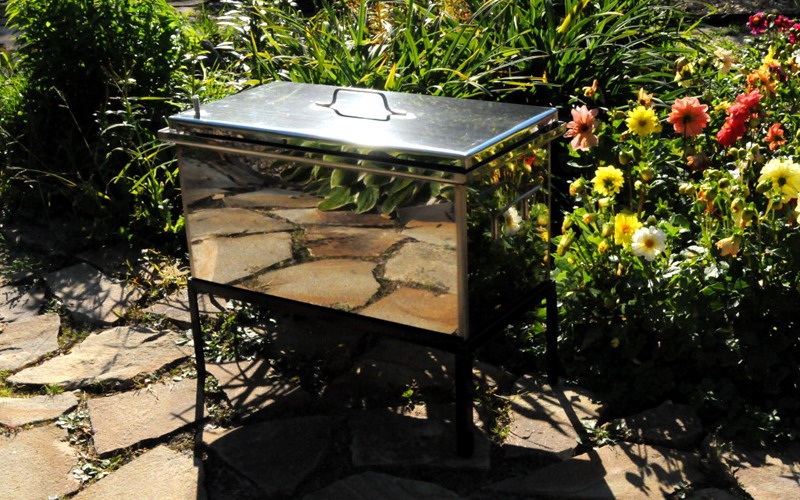 Это прямоугольный ящик, выполненный из 3 мм нержавеющей стали, в котором внутри приварены уголки для установки одной-двух решеток для мяса, усиленных ребрами жесткости для большей грузоподъемности. В нижней части коптильни располагается поддон для стекания жира, под который подкладывается охапка щепы различных сортов дерева для придания мясу определенного аромата, и крышка с сопуном и гидрозатвором. Сталь в месте жара используется минимальной толщиной 2 мм, т.к. более тонкую стенку ведет от высоких температур, она деформируется и темнеет. Дно бывает как плоское, так и выступающее вверх.