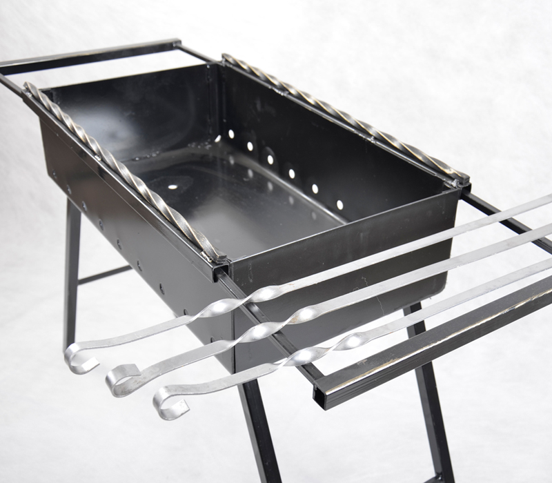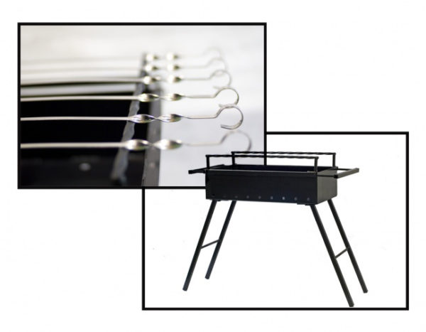 — Из вспомогательного оборудования имеется: выдвижные полочки для шампуров, выдвижные боковые ручки для удобной переноски мангала и установки подносов;